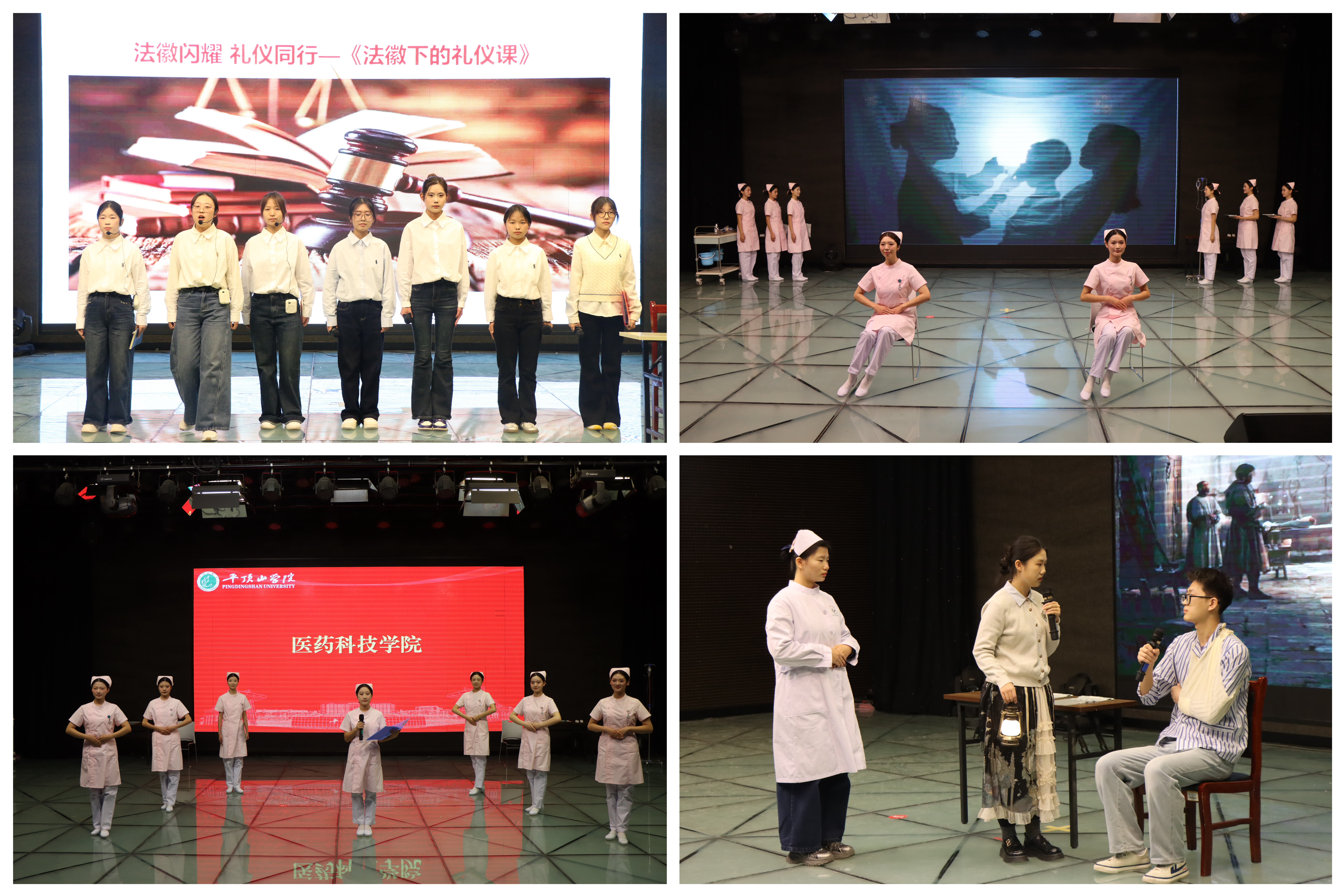 赛场气氛热烈,精彩纷呈。各参赛队伍紧扣“知礼于心,践礼于行”的主题,将礼仪规范讲解与专业特色表演深度融合。医药科技学院将严谨的医护礼仪融入文艺表演,传递职业礼仪背后的温情;旅游与规划学院将礼仪动作与茶艺展示巧妙结合,让古典礼仪焕发出时代魅力;电气与机械工程学院和医学院的礼仪走秀表演中,选手们仪态端庄、服饰得体,诠释了校园与社交礼仪的规范细节;政法学院通过模拟法庭场景展示了司法礼仪,彰显了法律人严谨求实、敬畏规则的法治精神;教师教育学院则自编情景剧,生动演绎了师生交往、职场办公中的礼仪要点,引发观众共鸣。其他学院也各展所长,通过清晰的讲解和精彩的表演,深化了师生对文明礼仪的理解。